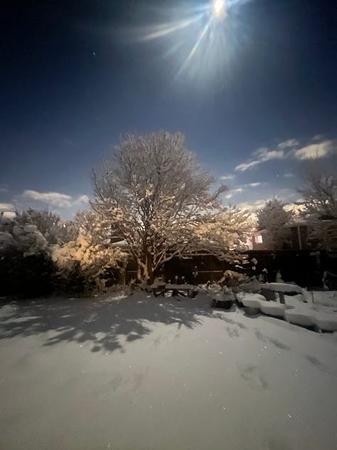 It is the darkest week of the year, and I’ve been loving it. (This year’s Seasonal Affective Disorder is brought to you by Wellbutrin.) I am in full hygge mode: slipper socks, weighted blankets, fluffy bathrobes, soft hats, and a stack of novels. The past few weeks have gifted us with some absolutely incredible skies—the last full moon was so bright it left moon shadows on the snowy backyard. I nearly had a beauty-gasm (oh my god, an “awe-gasm?” I’ve taken it too far again, haven’t I?) and my daughter was only mildly impressed and mostly confused about why I dragged her outside without shoes to behold this gorgeous vision.