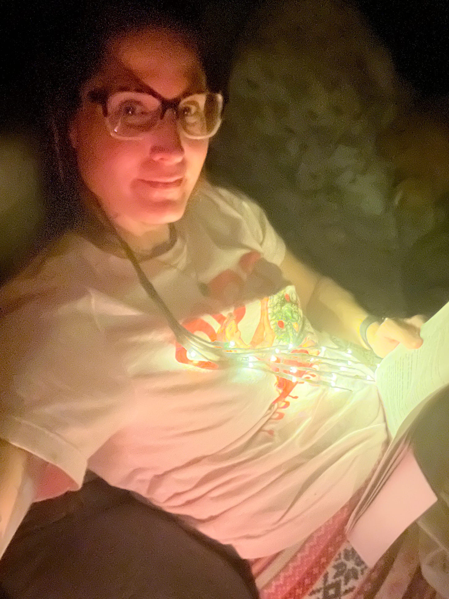 She retreated with her phone and the portable charger, on its last legs, and I went up to my bedroom with a flashlight, lit all the candles I could find, and draped fairy lights over my shoulder to cast enough light on the book I had just started. Even though it was a waste of my battery, I played my French Cafe Vibes playlist as I read my WWII novel, buried under weighted blankets, dog nestled against me.